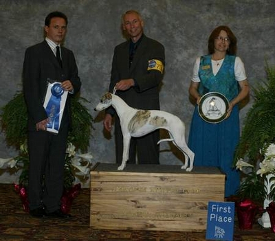 Winning the puppy bitch class at the 2004 National Whippet Specialty held in Greensboro, NC.