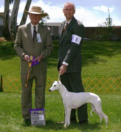 Lauren is a smooth beauty with generous length and fantastic movement. She is our most vocal whippet and just loves to sing La Traviata! Lauren is shown going Best of Breed from the puppy class in Placerville, California. Owned by Bill and Suzanne Downie